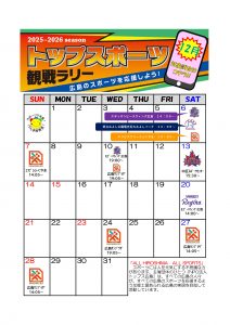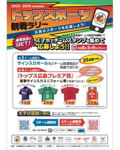 トップス広島加盟チームの試合を観戦して、スマートフォンでスタンプを集めて応募すると、豪華賞品が抽選で当たる『2025-2026seasonトップスポーツ観戦ラリー』の12月対象試合を紹介します!!